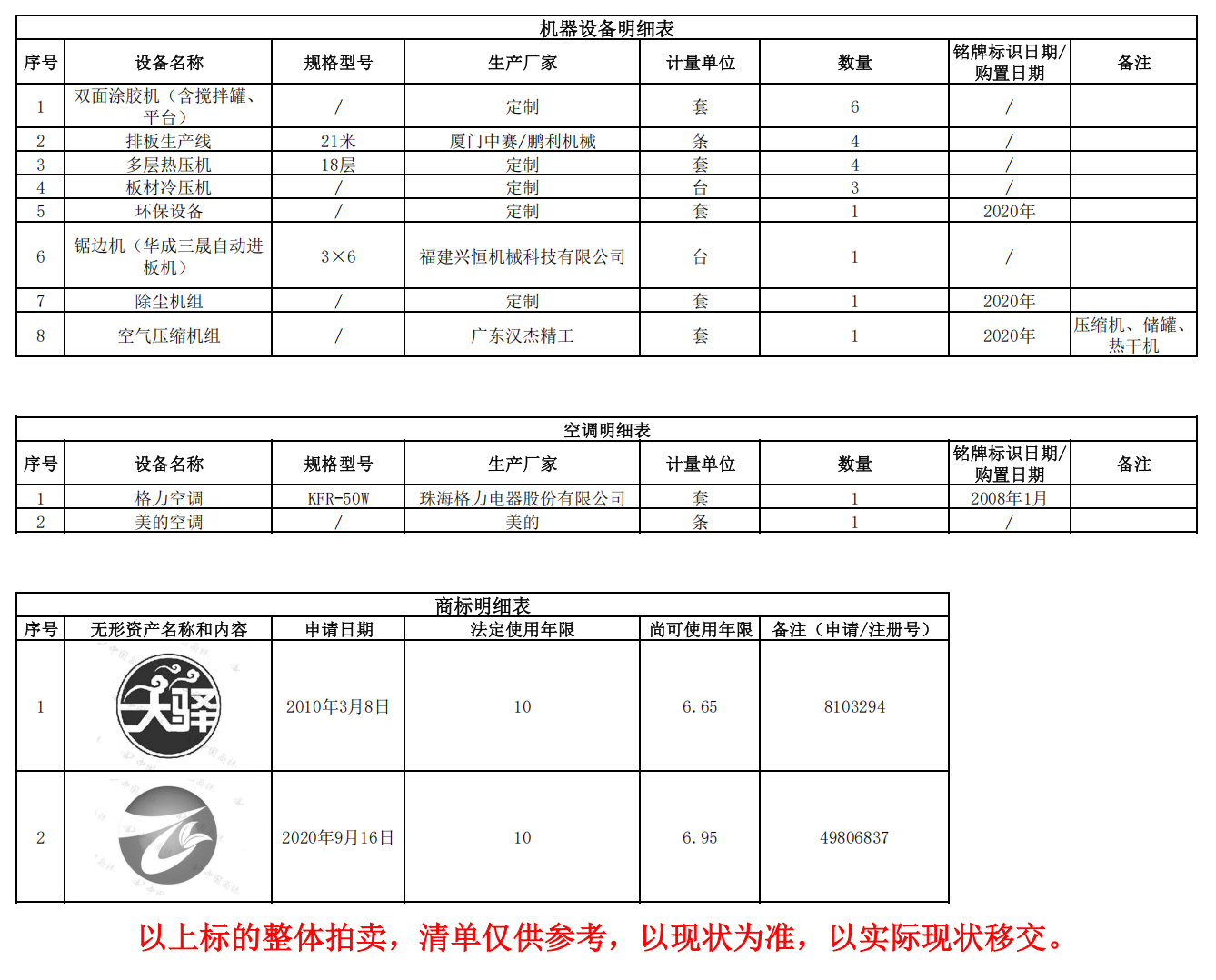 一、拍賣標(biāo)的:六安市葉集區(qū)天億木業(yè)有限責(zé)任公司位于葉集綠色板材工業(yè)園的機(jī)器設(shè)備一批、空調(diào)兩臺(tái)、商標(biāo)兩項(xiàng),參考價(jià):26.195萬元。標(biāo)的物以現(xiàn)狀為準(zhǔn),以實(shí)際現(xiàn)狀移交。標(biāo)的明細(xì)見下方: