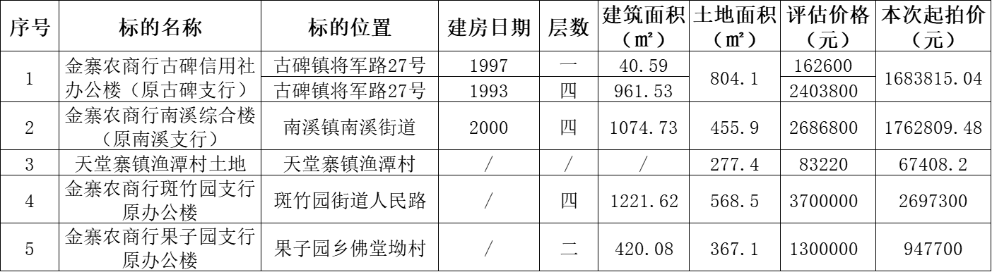 金寨農(nóng)商行閑置房地產(chǎn):古碑信用社辦公樓(原古碑支行)、南溪綜合樓(原南溪支行)、天堂寨鎮(zhèn)漁潭村土地、斑竹園支行原辦公樓、果子園支行原辦公樓等五處資產(chǎn),F(xiàn)狀拍賣,現(xiàn)狀移交。標的詳情見下方所附清單:
