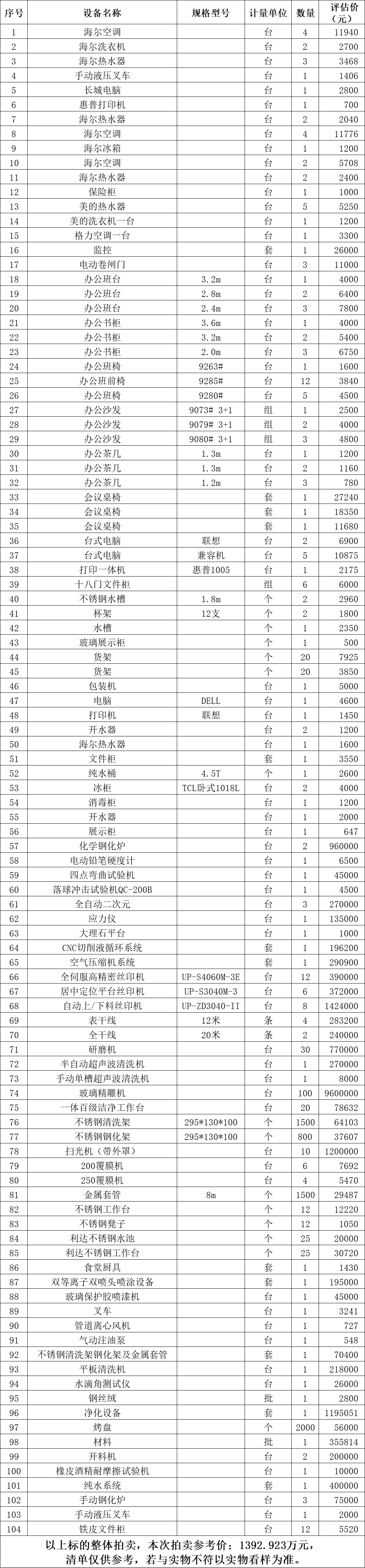 以現(xiàn)狀拍賣,現(xiàn)狀移交。標(biāo)的清單見下方表格。所附清單上標(biāo)的的數(shù)量及規(guī)格型號(hào)、廠家等信息僅供參考,若與實(shí)物不符以實(shí)物看樣為準(zhǔn),成交后以現(xiàn)場實(shí)物為準(zhǔn)移交。成交后,委托方提供增值稅專用發(fā)票。