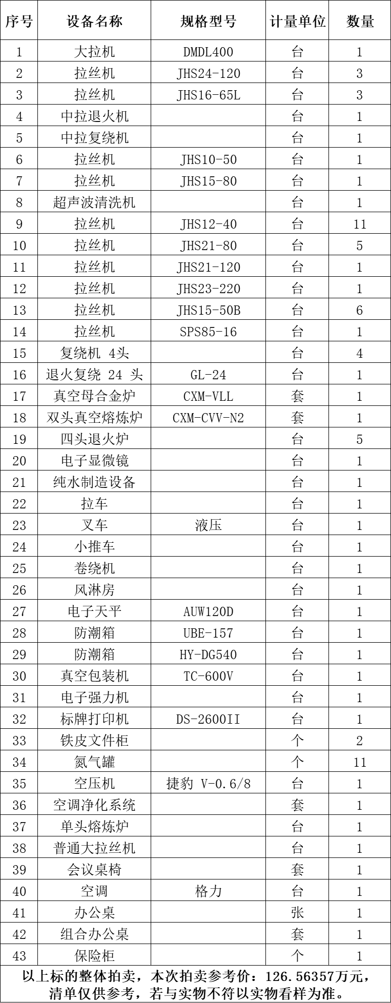 一、拍賣標(biāo)的:雙頭真空熔煉爐、真空母合金爐、空調(diào)凈化系統(tǒng)、拉絲機(jī)、復(fù)繞機(jī)4頭、大拉機(jī)、單頭熔煉爐等二手設(shè)備一批,整體拍賣,參考價:126.56357萬元。競買保證金:15萬元。