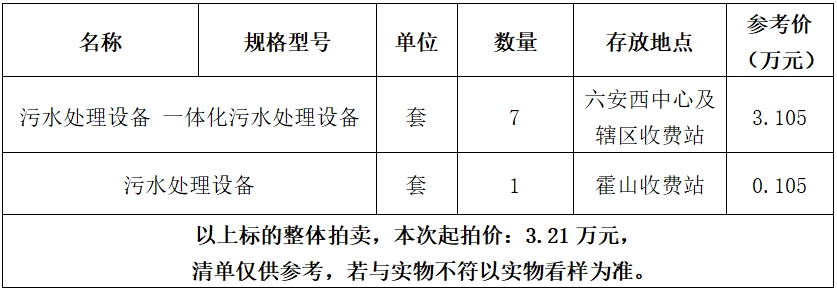 1、污水處理設(shè)備一批,起拍價(jià):3.21萬元,競買保證金:1萬元。標(biāo)的詳情見下方所附清單: