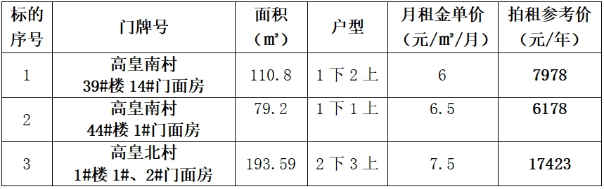 一、拍租標(biāo)的:六安市裕安區(qū)平橋工業(yè)園高皇南、北村安置小區(qū)部分門面房3年期租賃經(jīng)營(yíng)權(quán),標(biāo)的詳情見下表: