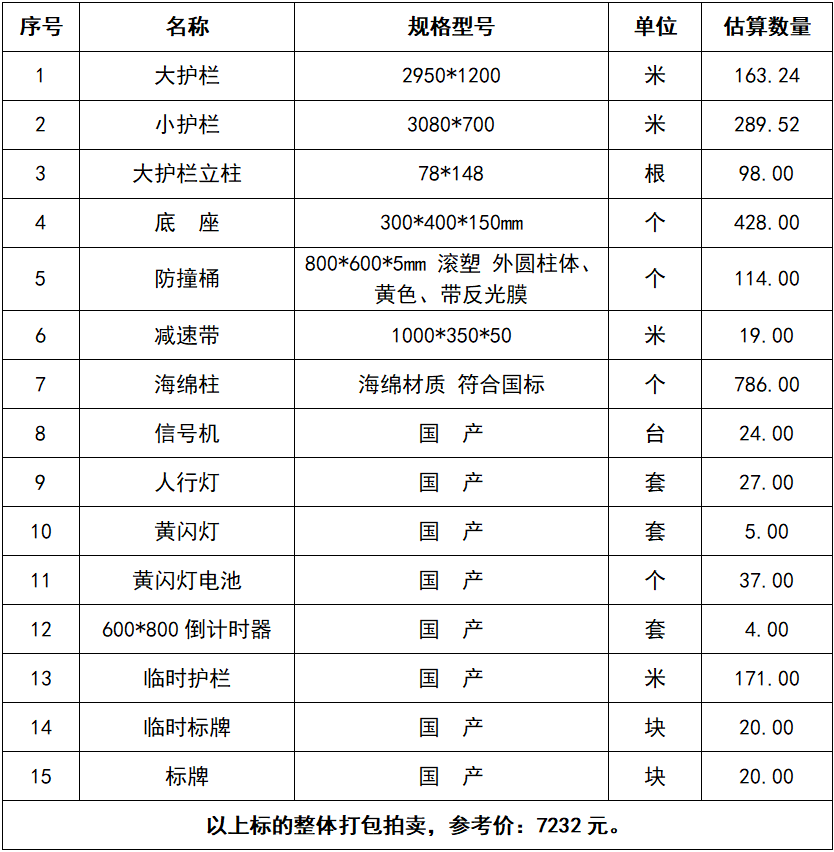 一、拍賣(mài)標(biāo)的:廢舊物資一批,包括護(hù)欄、防撞桶、黃閃燈電池等,參考價(jià):7232元。