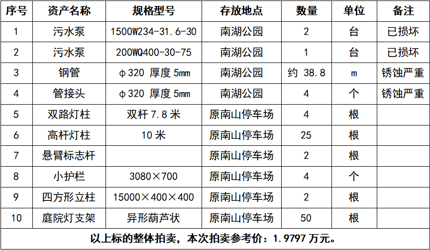 1、廢舊設(shè)備耗材一批,包括污水泵、鋼管、高桿燈柱、懸臂標志桿、四方形立柱等,參考價:1.9797萬元,競買保證金:1萬元。