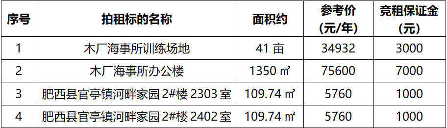 三、注意事項:有意競租者請交納保證金至賬戶:安徽邦德拍賣有限公司,開戶銀行:中國工商銀行股份有限公司六安解放路支行,賬號:1314202409300068442,并于拍賣會前完成網(wǎng)上報名手續(xù)。競買不成,保證金5個工作日內(nèi)無息退還。成交后,買受人需向中拍平臺支付0.15%軟件使用費。