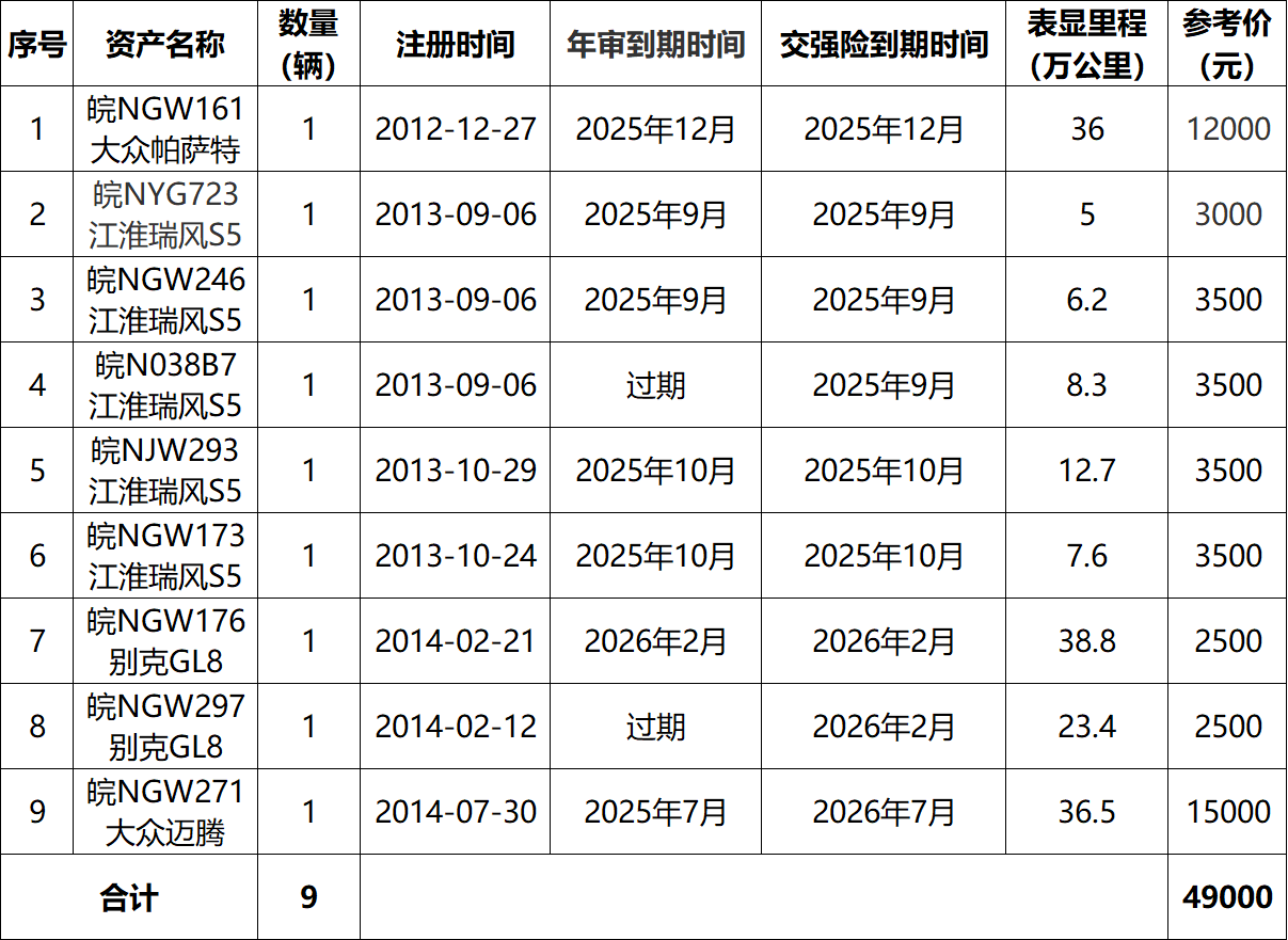一、拍賣標(biāo)的:皖NGW161大眾帕薩特、皖NYG723江淮瑞風(fēng)等二手車9輛,整體打包拍賣,整體參考價:4.9萬元。競買保證金:1萬元。標(biāo)的詳情見下方清單:
