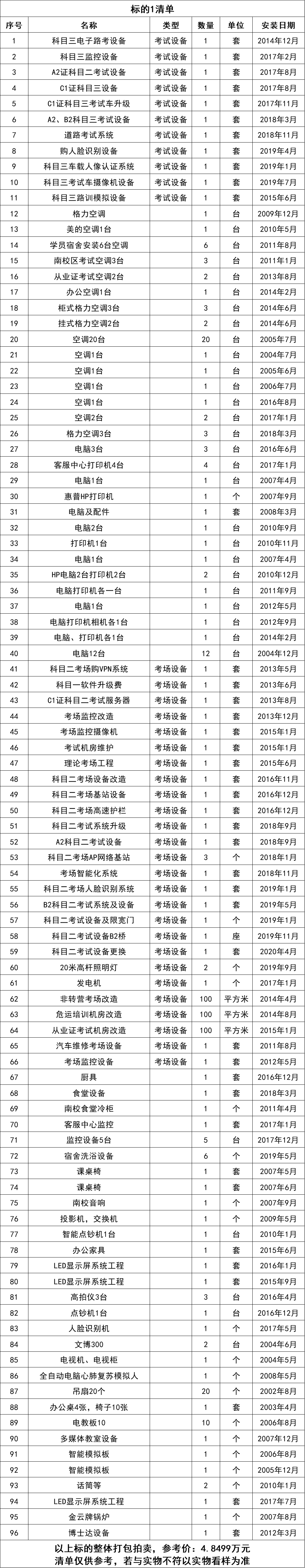 1、空調(diào)、考場高速護欄、考試設備等廢舊物資一批,打包拍賣。參考價:4.8499萬元,競買保證金:1萬元。標的清單見下方表格(清單僅供參考,若與實物不符以實物看樣為準):