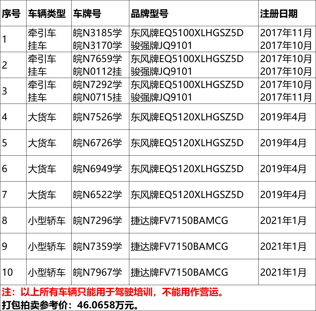 4、皖N3185學/皖N3170學牽引掛車、皖N7526學東風牌大貨車、皖N7296學捷達牌小型轎車等10輛二手車,打包拍賣。參考價:46.0658萬元,競買保證金:5萬元。標的詳情見下表: