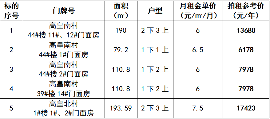 一、拍租標(biāo)的:六安市裕安區(qū)平橋工業(yè)園高皇南、北村安置小區(qū)部分門面房3年期租賃經(jīng)營權(quán),標(biāo)的詳情見下表: