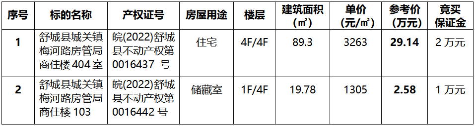 一、拍賣標(biāo)的:舒城縣城關(guān)鎮(zhèn)梅河路房管局商住樓404室住宅房及103儲(chǔ)藏室,拍賣標(biāo)的詳情見下表: