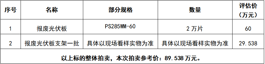 一、拍賣(mài)標(biāo)的:報(bào)廢光伏板2萬(wàn)片及報(bào)廢光伏板支架一批(具體以現(xiàn)場(chǎng)看樣實(shí)物為準(zhǔn)),整體拍賣(mài),參考價(jià):89.538萬(wàn)元。競(jìng)買(mǎi)保證金:15萬(wàn)元。