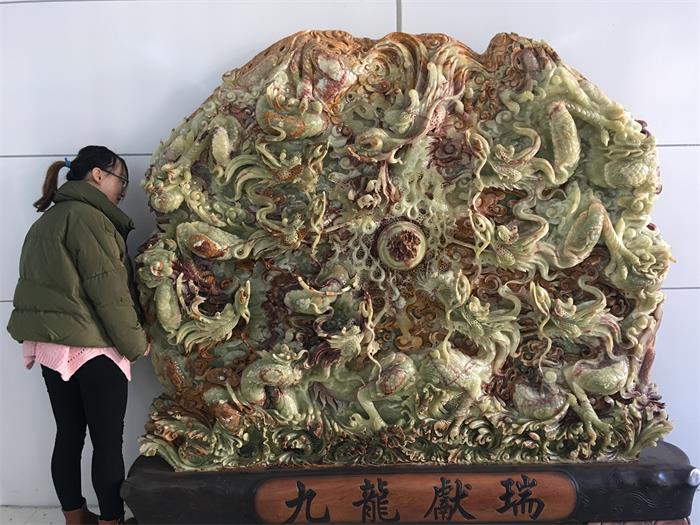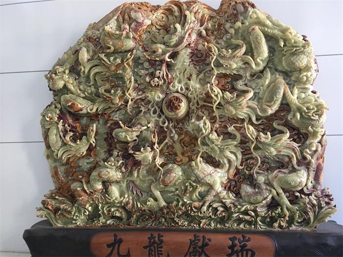 一、拍賣標的:九龍獻瑞玉石雕刻擺件一件,長2.16m,高2m。參考價9.8萬元。