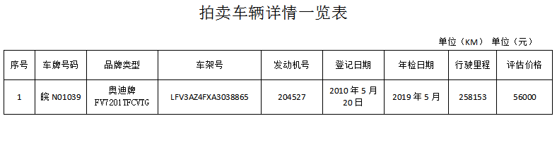 一、拍賣標(biāo)的:皖N01039奧迪牌FV7201TFCVTG轎車,2010年5月注冊(cè),參考價(jià)5.6萬元。