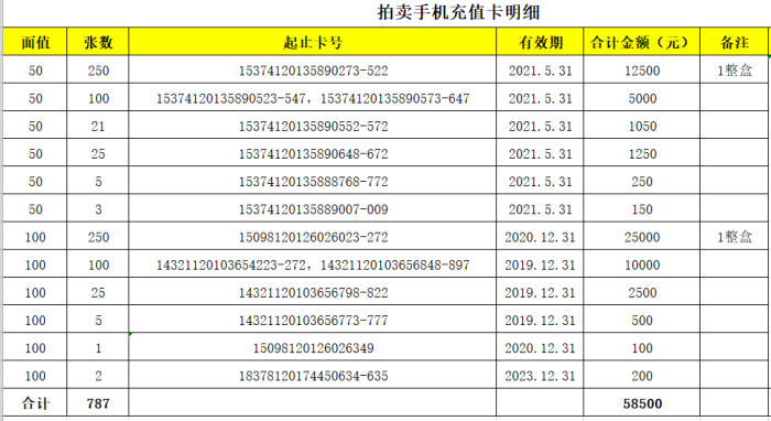 一、拍賣標的:787張中國移動手機充值卡,其中:充值卡單張面值50元的404張,合計20200元;充值卡單張面值100元的383張,合計38300元。