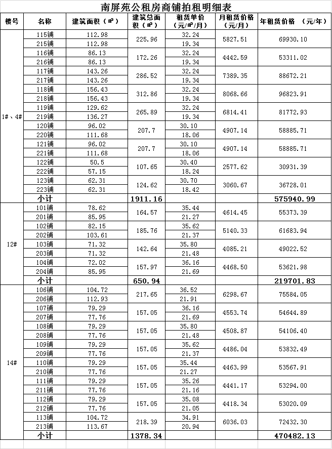 1、南屏苑公租房1#、4#樓商鋪5年租賃經(jīng)營權(quán),9上9下計(jì)18間,總建筑面積約1911.16㎡,整體拍租,參考價(jià)57.6萬元/年,競(jìng)租保證金12萬元;