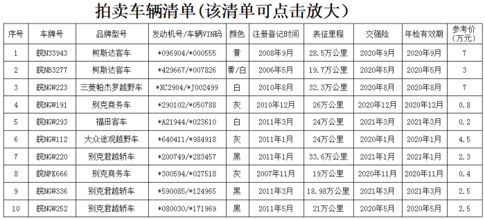 10輛公務(wù)用車(車牌號為本次拍賣車輛的依據(jù),拍賣不含車輛號牌,詳見拍賣清單)。違章由車輛原單位處理,車輛以交付時的實(shí)際情況為準(zhǔn),參考價:0.2-7萬元/輛。