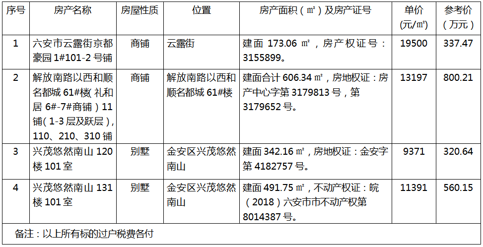 1、六安市云露街京都豪園1#101-2號鋪,房產(chǎn)權(quán)證號:3155899,建筑面積173.06㎡,參考價337.47萬元;