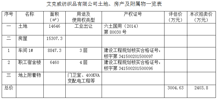 六安市金安經(jīng)濟開發(fā)區(qū)艾克威紡織品有限公司工業(yè)房地產(chǎn)拍賣公告
