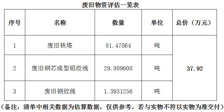 一、拍賣標(biāo)的:廢舊鋼芯成型鋁絞線、廢舊鐵塔、廢舊鋼絞線等廢舊物資一批。整體拍賣,參考價(jià)37.92萬(wàn)元。