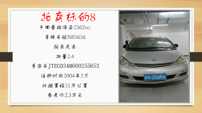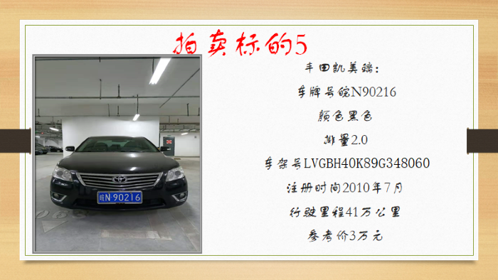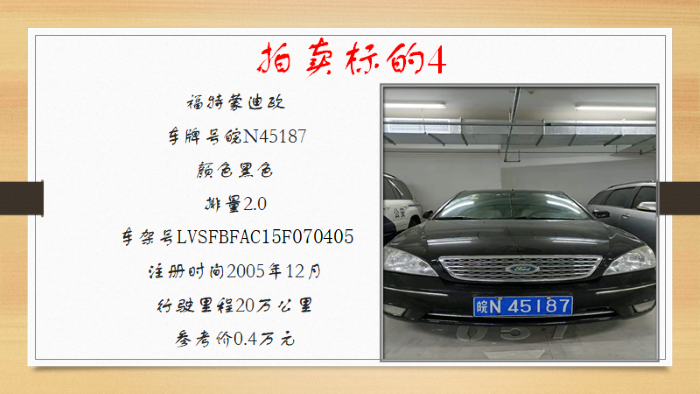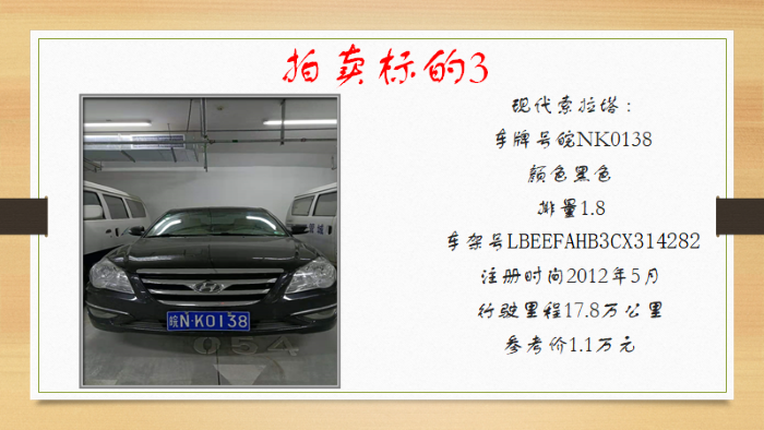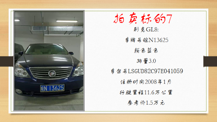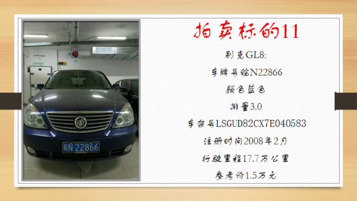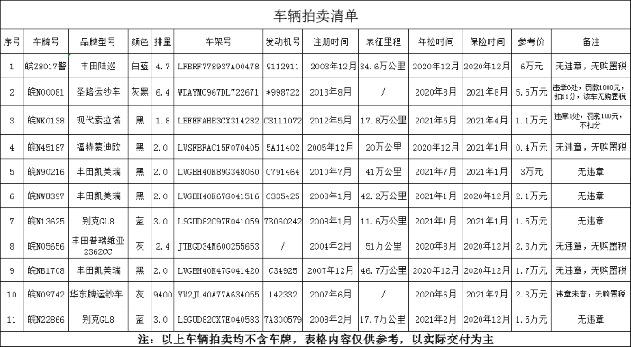 一、拍賣標(biāo)的:二手車11輛(車牌號(hào)為本次拍賣車輛的依據(jù),拍賣不含車輛號(hào)牌,詳見拍賣清單)。車輛以交付時(shí)的實(shí)際情況為準(zhǔn),參考價(jià):0.4萬元-6萬元/輛。