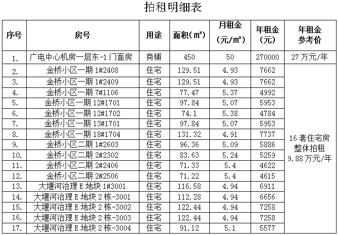 2、金橋小區(qū)一期、二期11套住宅房及大堰河治理E地塊(人民新村)5套住宅房的5年租賃經(jīng)營權(quán),總建筑面積合計(jì)約1624.99㎡,整體拍租,約5元/㎡/月,參考價9.88萬元/年。競租保證金1萬元。