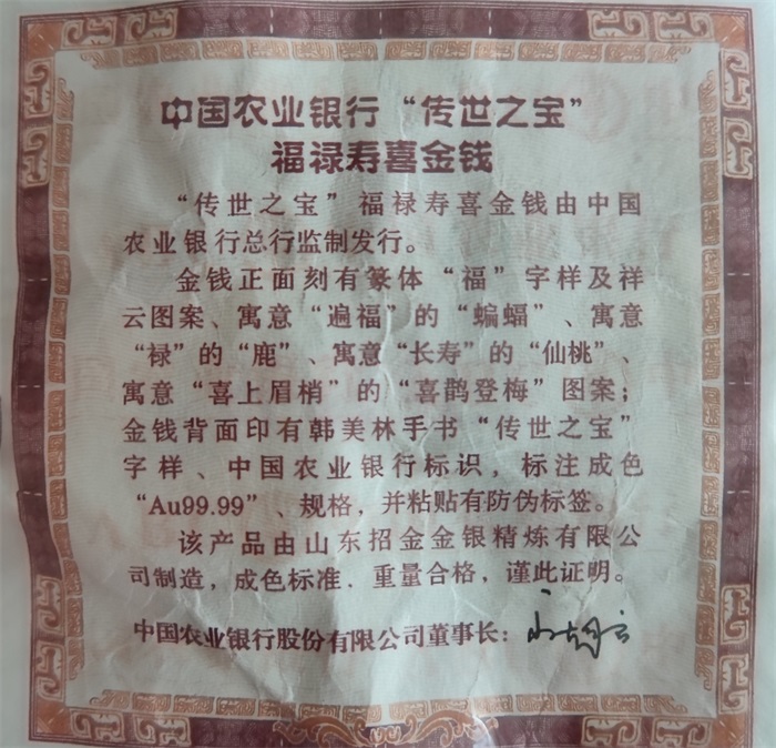 1、中國農(nóng)業(yè)銀行福祿壽喜傳世之寶金錢30枚,質(zhì)量5克/枚。優(yōu)先整體拍賣,整體無人競買,再分拆為每枚為一個(gè)標(biāo)的。參考價(jià):1836元/枚。競買保證金整體為1萬元,每枚保證金1000元。標(biāo)注成色“Au99.99”。