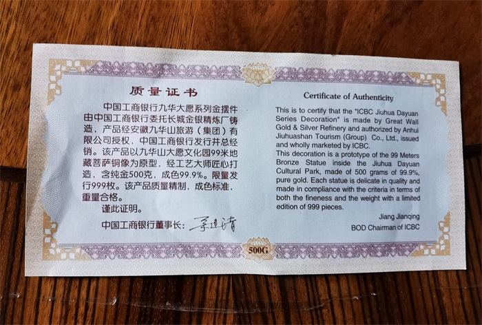 3、限量版中國工商銀行九華大愿系列金佛一座,質(zhì)量2880.83克(含純金500克)。該佛像由中國工商銀行委托長城金銀精煉廠鑄造,經(jīng)安徽九華山旅游集團(tuán)公司授權(quán),限量發(fā)行999枚,該產(chǎn)品以九華山大愿文化園99米地藏菩薩像為原型,經(jīng)工藝大師匠心打造,含純金500克,參考價(jià)18.36萬元。競買保證金2萬元。