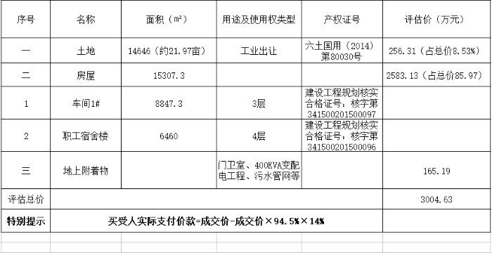 位于六安市金安經(jīng)濟(jì)開發(fā)區(qū)鳳凰路與山源路交匯處六安艾克威紡織品有限公司所擁有的房產(chǎn)(約15307.3㎡)、工業(yè)土地(約14646㎡)、附屬物等。參考價(jià)1639.4萬元。拍賣成交后,買受人最終實(shí)際支付價(jià)款為:成交價(jià)-成交價(jià)×94.5%×14%,成交價(jià)×94.5%為標(biāo)的成交價(jià)款中土地房產(chǎn)的占比價(jià),即成交價(jià)扣除該標(biāo)的土地房產(chǎn)初始登記及交易相關(guān)稅費(fèi)14%為買受人最終實(shí)際支付價(jià)款。本次扣除以預(yù)計(jì)比例14%扣除標(biāo)的土地房產(chǎn)初始登記及交易相關(guān)稅費(fèi),后期實(shí)際辦理房地權(quán)證及轉(zhuǎn)移登記到競(jìng)買人名下過程中,無論產(chǎn)生多少稅費(fèi),包括按照法律規(guī)定應(yīng)由委托方(即六安艾克威紡織品有限公司)承擔(dān)的稅費(fèi),均由買受人承擔(dān)。