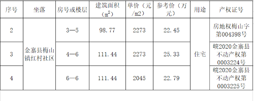 標(biāo)的2-4:位于金寨縣梅山鎮(zhèn)紅村社區(qū)住宅房三套,價(jià)低,2045-2273元/㎡,約22-25萬(wàn)元/套。