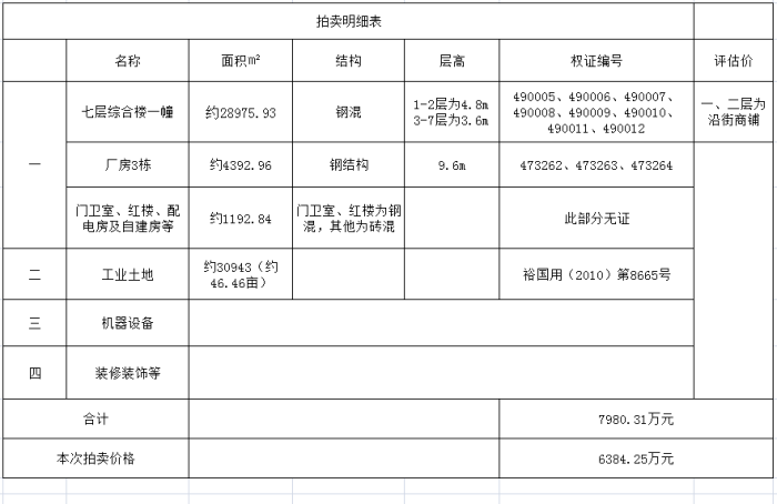位于六安市裕安區(qū)城南鎮(zhèn)、沿105國道、省級高新區(qū)六安高新技術(shù)產(chǎn)業(yè)開發(fā)區(qū),六安市鴻源機(jī)械有限責(zé)任公司所擁有的房屋建筑物及附屬、土地、機(jī)器設(shè)備、裝飾裝修等,包括:1、沿105國道七層綜合樓一幢,面積約28975.93㎡,1-2層層高約4.8m ,3-7層層高約3.6m,沿105國道及其他一樓現(xiàn)作沿街門面用,二樓及以上可作服裝廠用;單層鋼構(gòu)廠房三幢,面積約4392.96㎡,層高約9.6m。以上綜合樓及廠房均有證;門衛(wèi)室、配電房及自建房等,面積約1192.84㎡,此部分無證。2、工業(yè)出讓土地30943㎡,約46.41畝,土地使用權(quán)證號:裕國用(2010)第8665號;3、機(jī)器設(shè)備;4、裝飾裝修等。