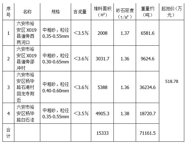四處存量砂石整體打包拍賣,整體參考價(jià)518.78萬元。本次拍賣成交后不過磅。詳情見下方清單(清單中相關(guān)數(shù)據(jù)僅供參考,以實(shí)際看樣為準(zhǔn),以現(xiàn)場實(shí)物移交),拍賣標(biāo)的品質(zhì)、數(shù)量等數(shù)據(jù)僅供參考,如與實(shí)際有出入,不改變成交結(jié)果,不改變標(biāo)的成交價(jià)款。