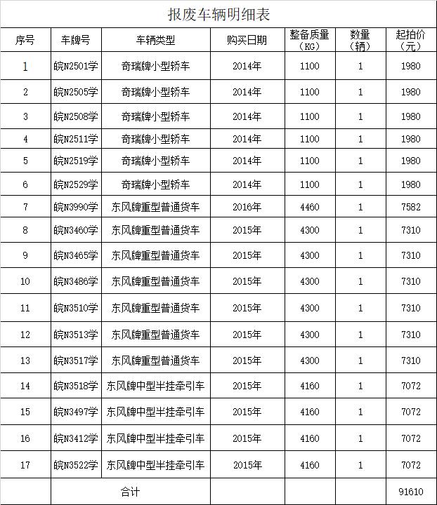 一、 拍賣標的:報廢車輛17輛,打包拍賣,參考價:9.161萬元。競拍保證金2萬元。標的詳情見下方清單: