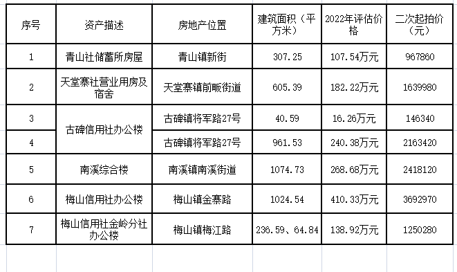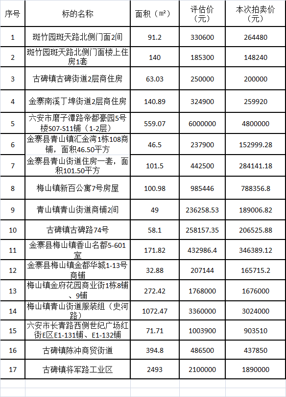2、商鋪及住房資產(chǎn),建筑面積約49㎡—559.07㎡/處,具體每處面積,評估價(jià)以及起拍價(jià)詳見下表: