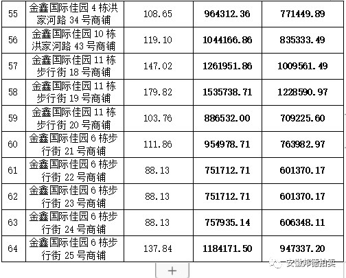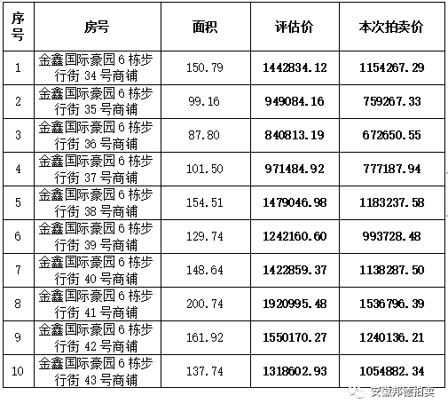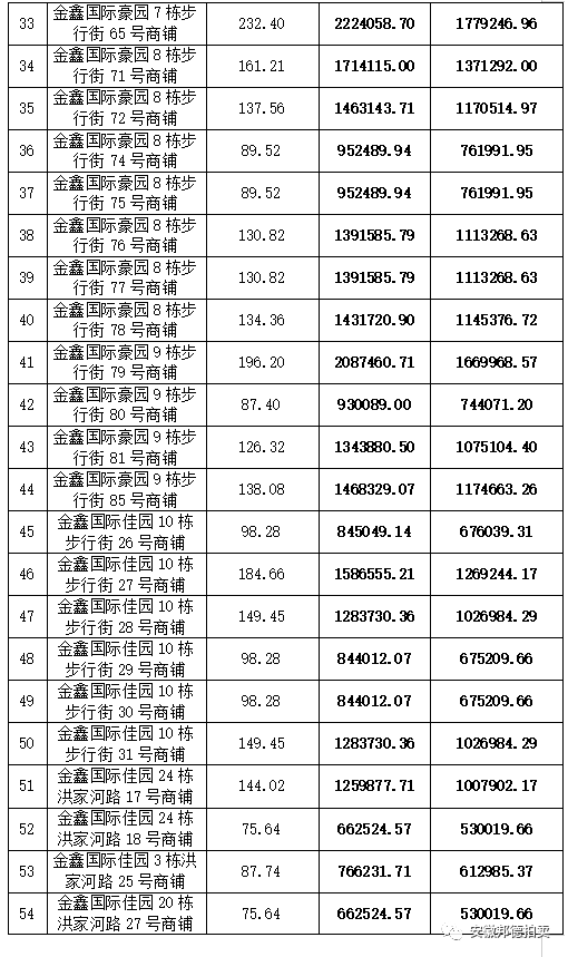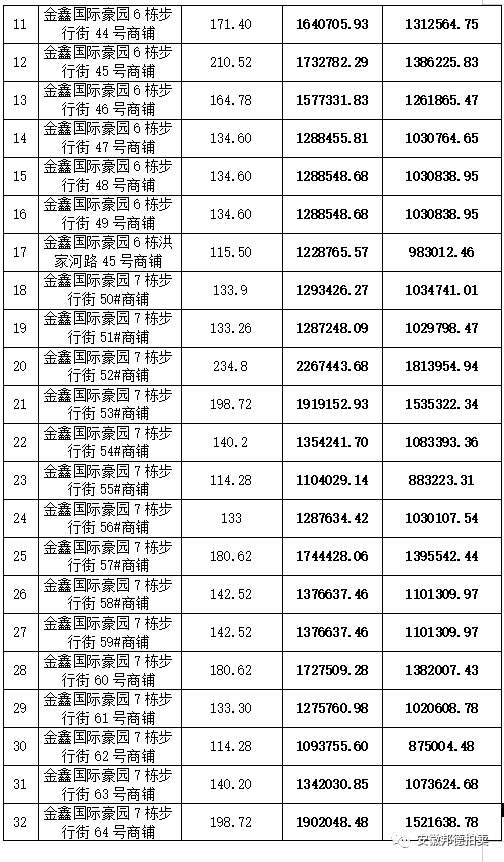 一、拍賣標(biāo)的: 金寨金鑫國際佳園、國際豪園小區(qū)商鋪,按間拍賣,建筑面積75㎡-210㎡/間。具體每間面積、價格詳見所附清單。