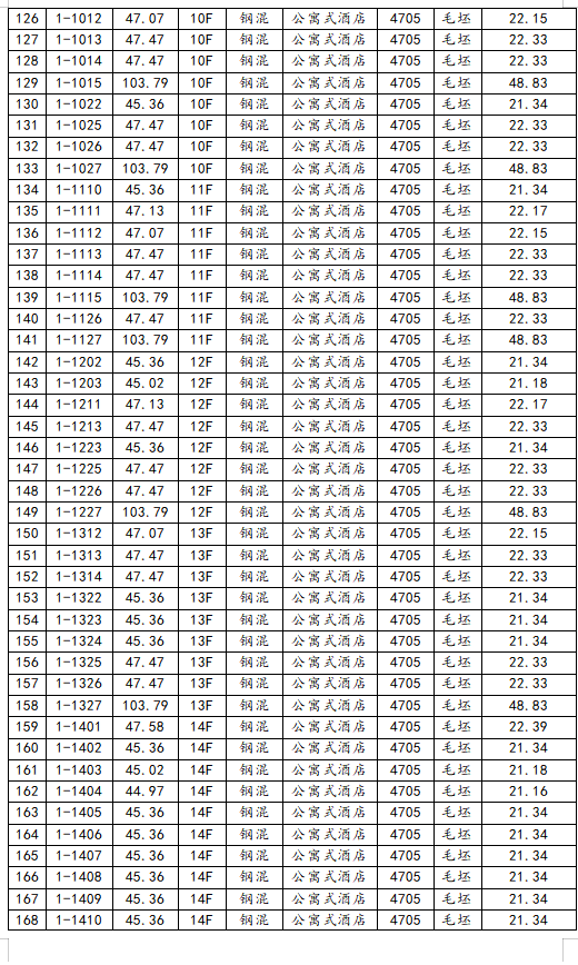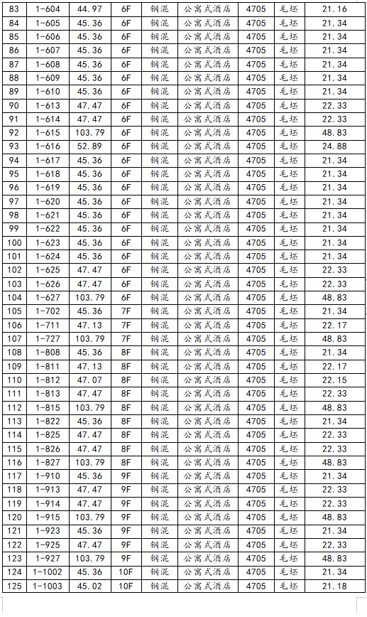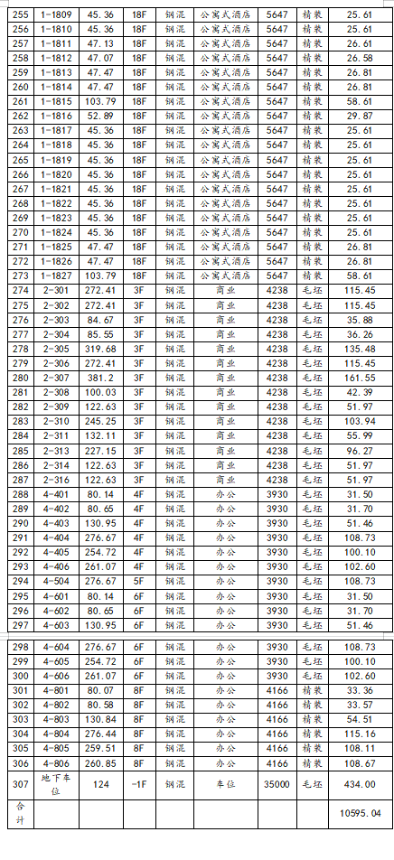 一、拍賣標(biāo)的:位于六安市金寨縣梅山鎮(zhèn)新城區(qū)紅石谷路以南、江天路以北金寨智慧萬匯廣場1、2、3、4號樓的部分房屋及地下車位。其中1號樓為商業(yè)用房和公寓式酒店,2號樓為商業(yè)用房,4號樓為辦公用房,房屋總計(jì)306套,地下車位124個。具體每套房屋所在樓棟、房號、面積、樓層、房屋用途、單價及每套房產(chǎn)價格詳見以下拍品清單: