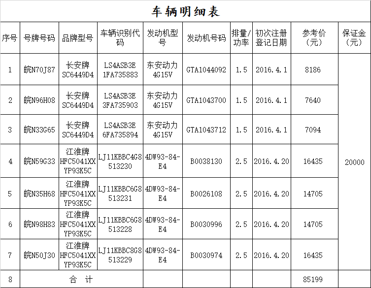 一、拍賣標(biāo)的:皖N70J87等二手車7輛,整體打包拍賣,參考價(jià):8.5199萬元,保證金:2萬元。車輛詳情見下方清單: