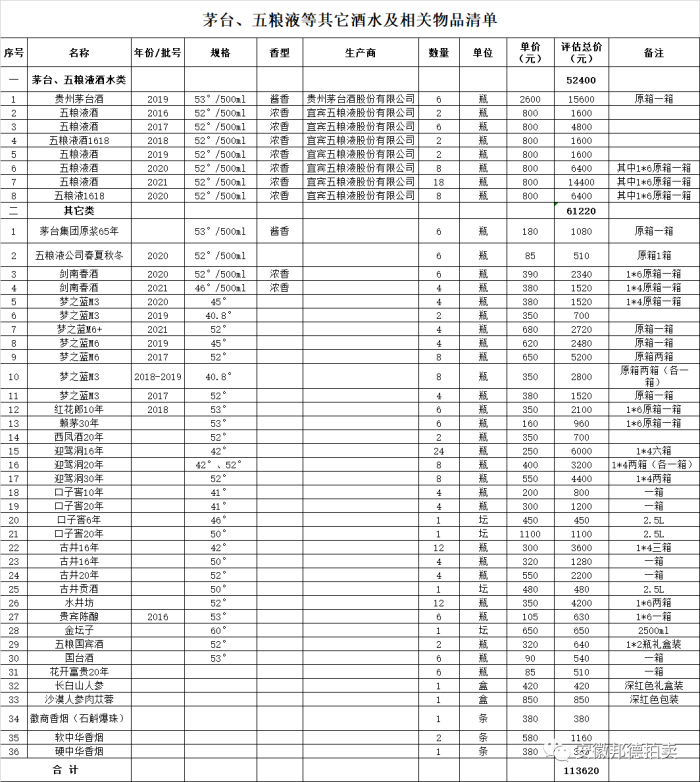 一、拍賣標(biāo)的:罰沒茅臺(tái)酒計(jì)6瓶;五糧液酒計(jì)46瓶及其他酒水、物品一批。參考價(jià):9.1萬元,競(jìng)買保證金:2萬元。具體詳見下方清單: