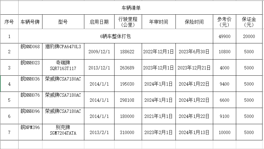 一、拍賣標(biāo)的:皖NND068獵豹越野、皖NNH023奇瑞越野、皖NNH036榮威750、皖NNH076榮威750、皖NNH096榮威750、皖NPM396別克君威6輛二手車,優(yōu)先整體打包拍賣,參考價(jià):49900元。整體拍賣不成,再分拆單個(gè)標(biāo)的進(jìn)行拍賣。拍賣標(biāo)的詳情見下表: