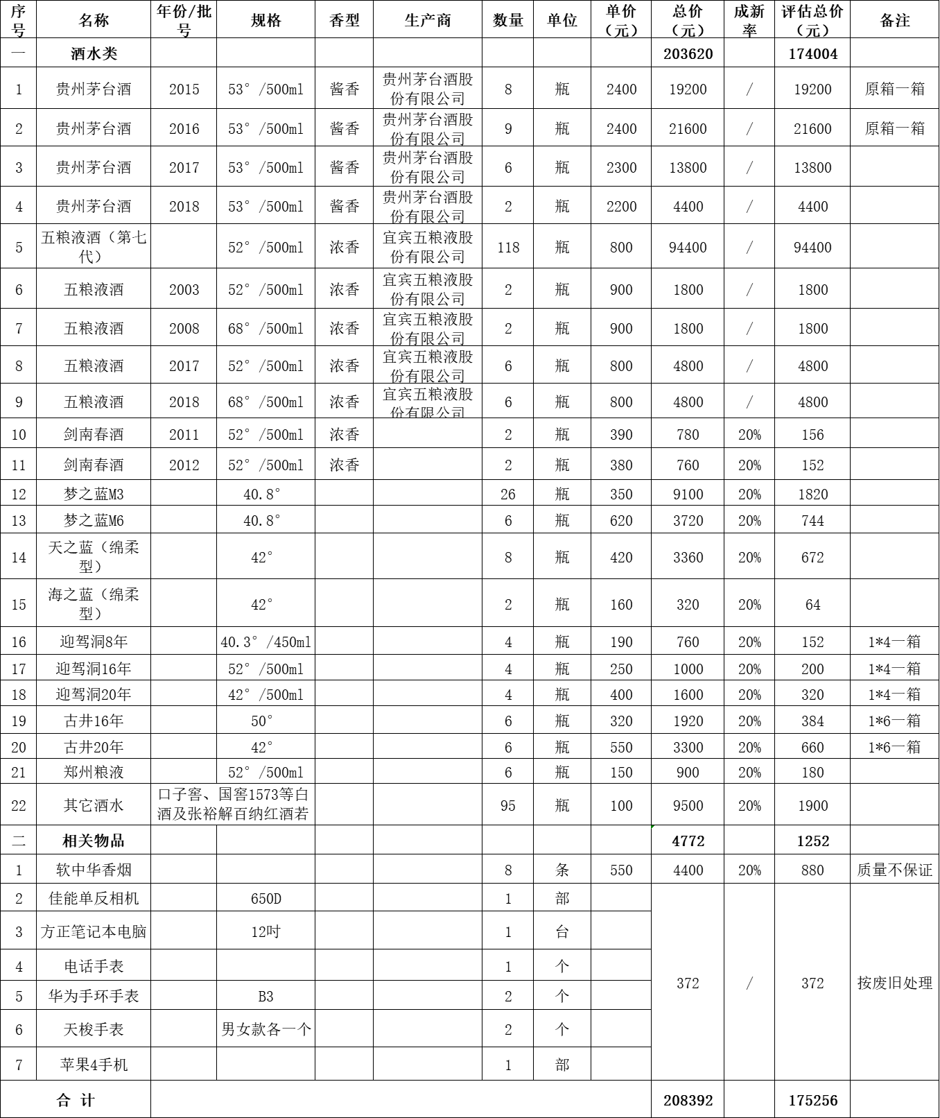 一、拍賣標(biāo)的:罰沒貴州茅臺酒計25瓶、五糧液酒計134瓶、其他酒水計171瓶及其他類物品一批。整體打包拍賣,參考價:175256元,保證金:3萬元。具體詳見下方清單: