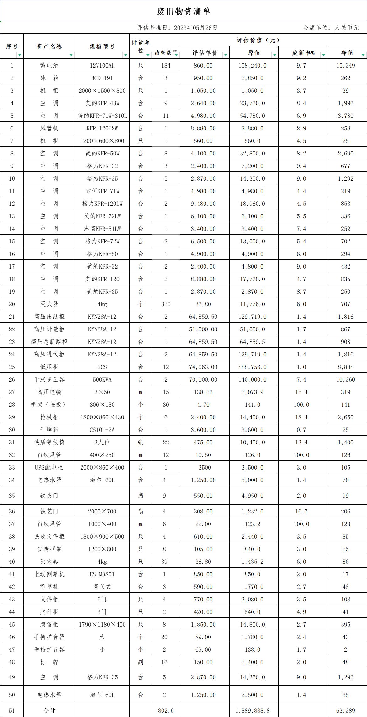一、拍賣標(biāo)的:廢舊物資一批,包括:報(bào)廢的空調(diào)、高壓出線柜、高壓計(jì)量柜、高壓總斷路柜、低壓柜、干式變壓器等,參考價(jià):6.3389萬元。標(biāo)的詳情見所附清單(清單僅供參考,若與實(shí)物不符以實(shí)物看樣為準(zhǔn))。