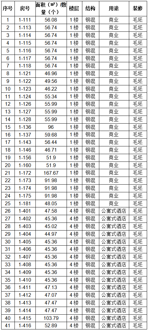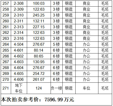 一、拍賣標(biāo)的:位于六安市金寨縣梅山鎮(zhèn)新城區(qū)紅石谷路以南、江天路以北,金寨智慧萬匯廣場(chǎng)1、2、3、4號(hào)樓304套房屋及124個(gè)地下車位,整體打包拍賣。參考價(jià):7596.99萬元。保證金:700萬元。標(biāo)的詳情詳見以下標(biāo)的物清單: