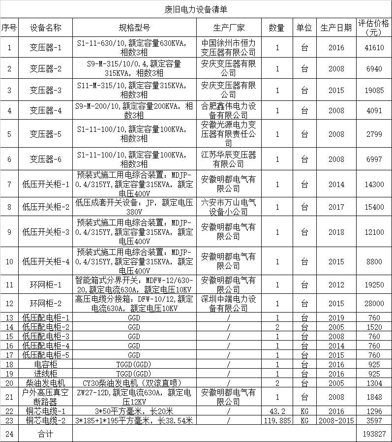 一、拍賣(mài)標(biāo)的:廢舊電力設(shè)備一批,包括:變壓器、電纜、低壓配電柜等,參考價(jià)19.3827萬(wàn)元。保證金2萬(wàn)元。