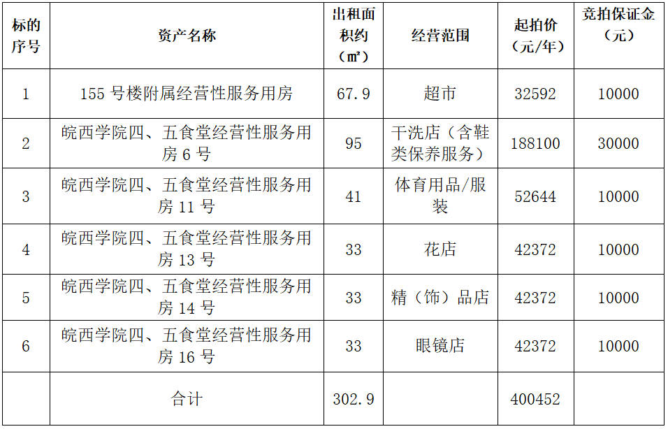 拍租標(biāo)的:皖西學(xué)院超市、體育用品店、精品店、眼鏡店、花店等經(jīng)營(yíng)性服務(wù)用房6處租賃經(jīng)營(yíng)權(quán),標(biāo)的詳情見(jiàn)下表: