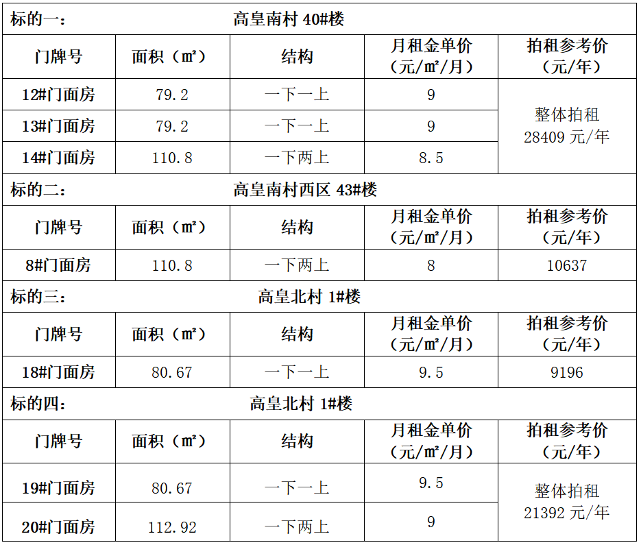 一、拍租標的:六安市裕安區(qū)平橋工業(yè)園高皇南、北村安置小區(qū)部分門面房3年期租賃經(jīng)營權(quán),標的詳情見下表: