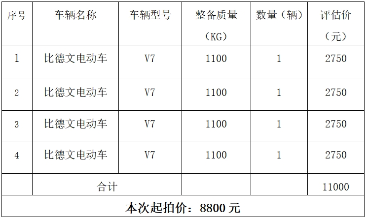 一、拍賣標(biāo)的:報廢比德文V7四輪電動車4輛,打包拍賣,參考價:8800元。競拍保證金5000元。標(biāo)的詳情見下方清單: