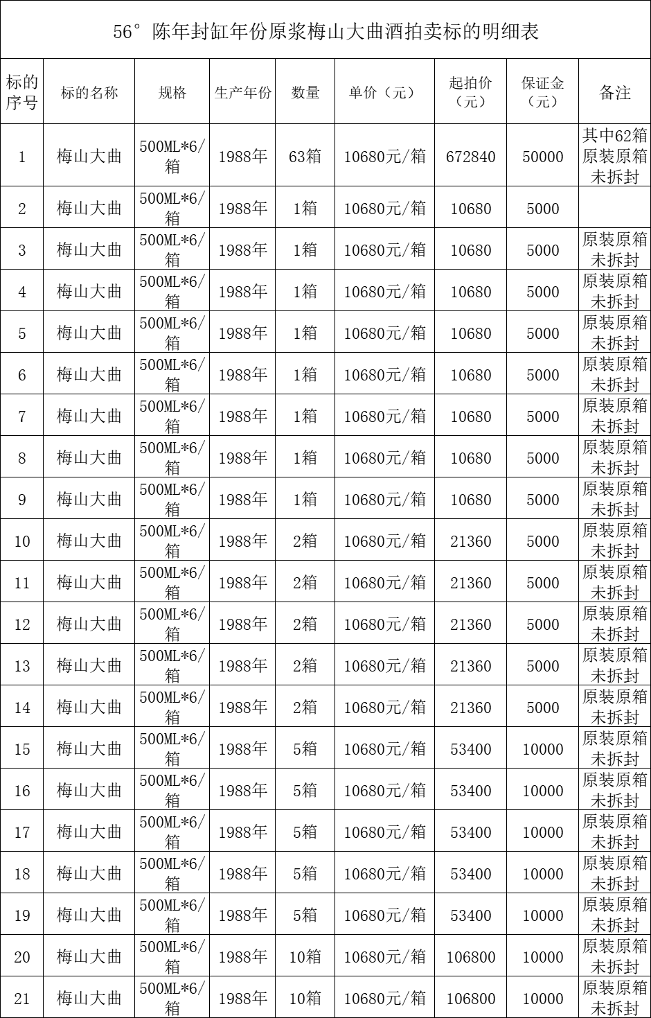一、拍賣標(biāo)的:56°陳年封缸年份原漿老酒梅山大曲酒63箱(每箱6瓶,共計(jì)378瓶),生產(chǎn)年份:1988年(為拆封箱酒的生產(chǎn)年份),其中62箱為原裝原箱,未拆封。優(yōu)先整體拍賣,整體不成交再分別分拆成1箱、2箱、5箱、10箱拍賣。具體標(biāo)的詳情見(jiàn)下方清單:
