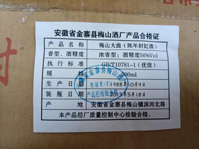 備注:1、本次拍賣標(biāo)的共計(jì)63箱,拆封一箱,顯示生產(chǎn)年份為1988年。其余推測(cè)為1988年,具體以實(shí)物為準(zhǔn),不影響成交結(jié)果。生產(chǎn)廠家:安徽省金寨縣梅山酒廠。