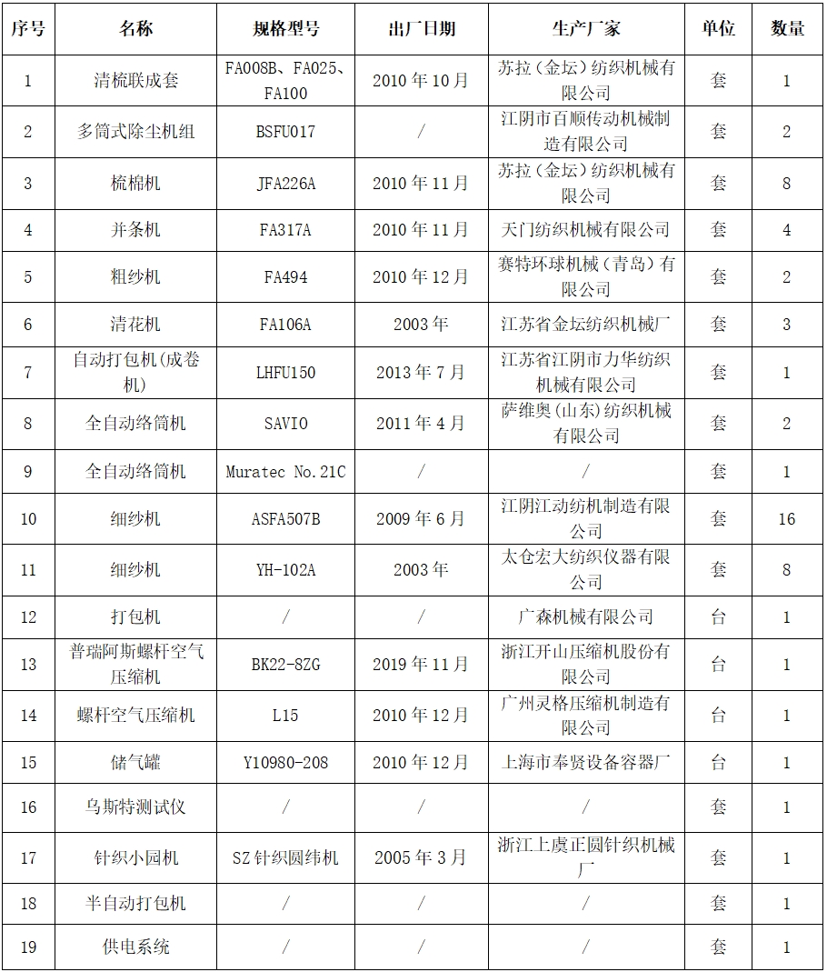 一、拍賣標(biāo)的:薩維奧等品牌全自動絡(luò)筒機(jī)、細(xì)紗機(jī)、清梳聯(lián)成套、梳棉機(jī)、清花機(jī)等二手紡織設(shè)備一批。以上標(biāo)的整體拍賣,參考價(jià)124.81萬元。標(biāo)的成交后,委托方提供增值稅專用發(fā)票。(標(biāo)的清單↓)