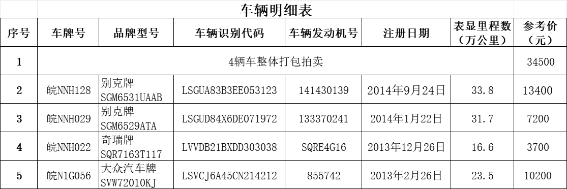 一、拍賣標(biāo)的:皖NNH128別克牌小型普通客車、皖NNH029別克牌小型普通客車、皖NNH022奇瑞牌轎車、皖N1G056大眾汽車牌轎車等4輛二手車,優(yōu)先整體打包拍賣,參考價(jià):3.45萬元。整體拍賣不成,再分拆單個(gè)標(biāo)的進(jìn)行拍賣。拍賣標(biāo)的詳情見下表: