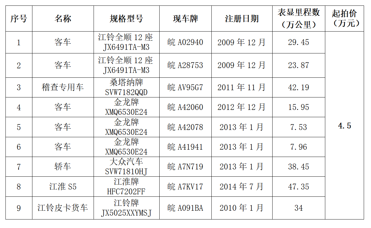 一、拍賣標(biāo)的:皖A42060金龍牌客車等9輛二手車,整體打包拍賣,參考價:4.5萬元。詳情見下表(更多標(biāo)的詳情見中拍平臺公告下方附件“標(biāo)的明細(xì)表”):